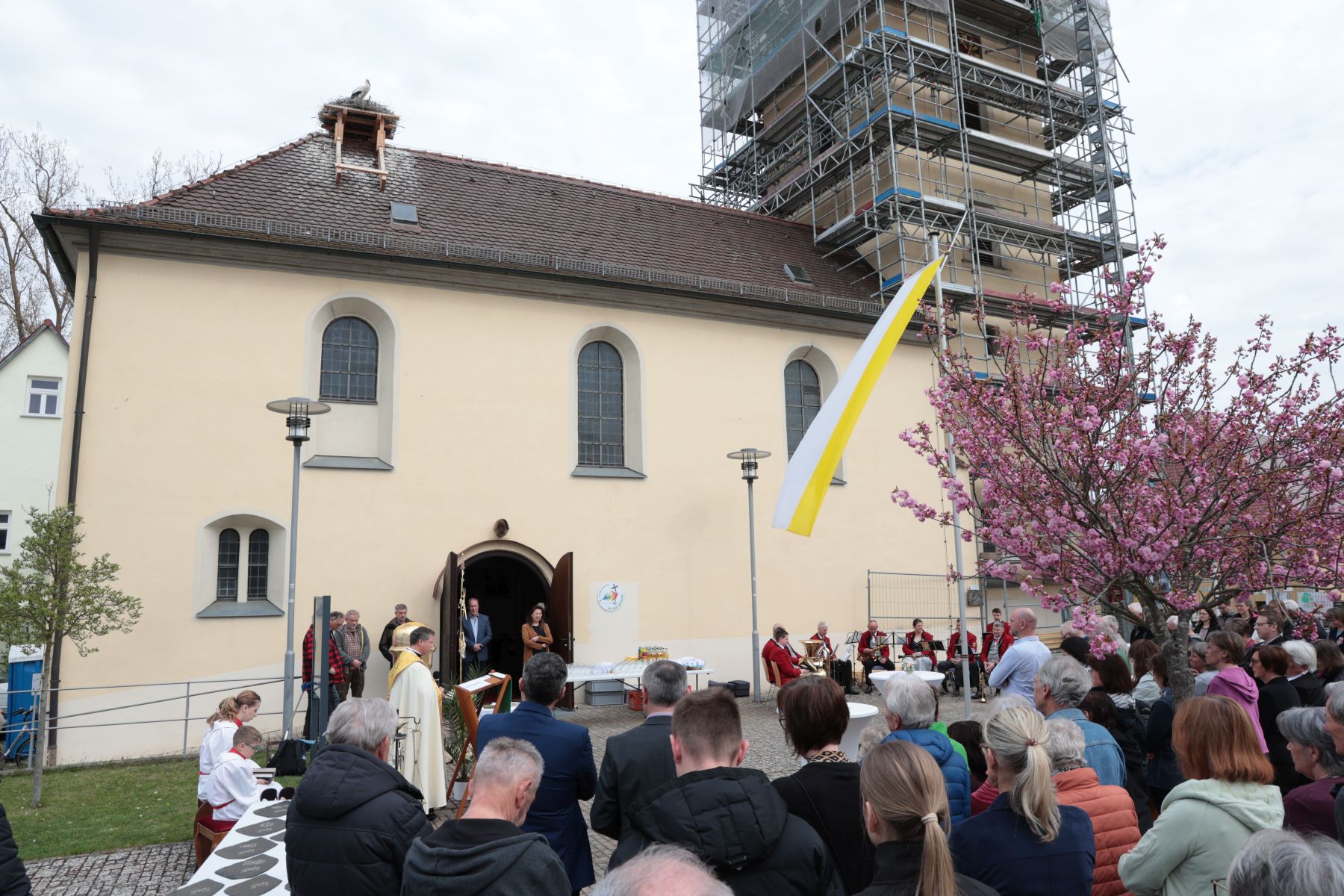 Es war ein feierlicher Moment. Pfarrer Matthias Steffel sprach sogar von einem „historischen Akt“. Unter den wachsamen Augen eines ganz besonderen „Publikums“ hat die Pfarrgemeinde St. Bartholomäus ein bedeutendes Etappenziel erreicht: Das frisch restaurierte und vergoldete Turmkreuz wurde wieder auf die Spitze des Kirchturms gesetzt – begleitet vom Pautzfelder Musikverein und zahlreichen Gläubigen, Dorfbewohnern und nicht zuletzt einem Storchenpaar, das längst zum Symbol der Sanierung geworden ist.