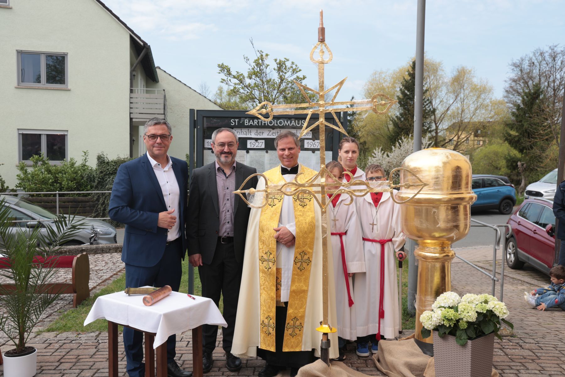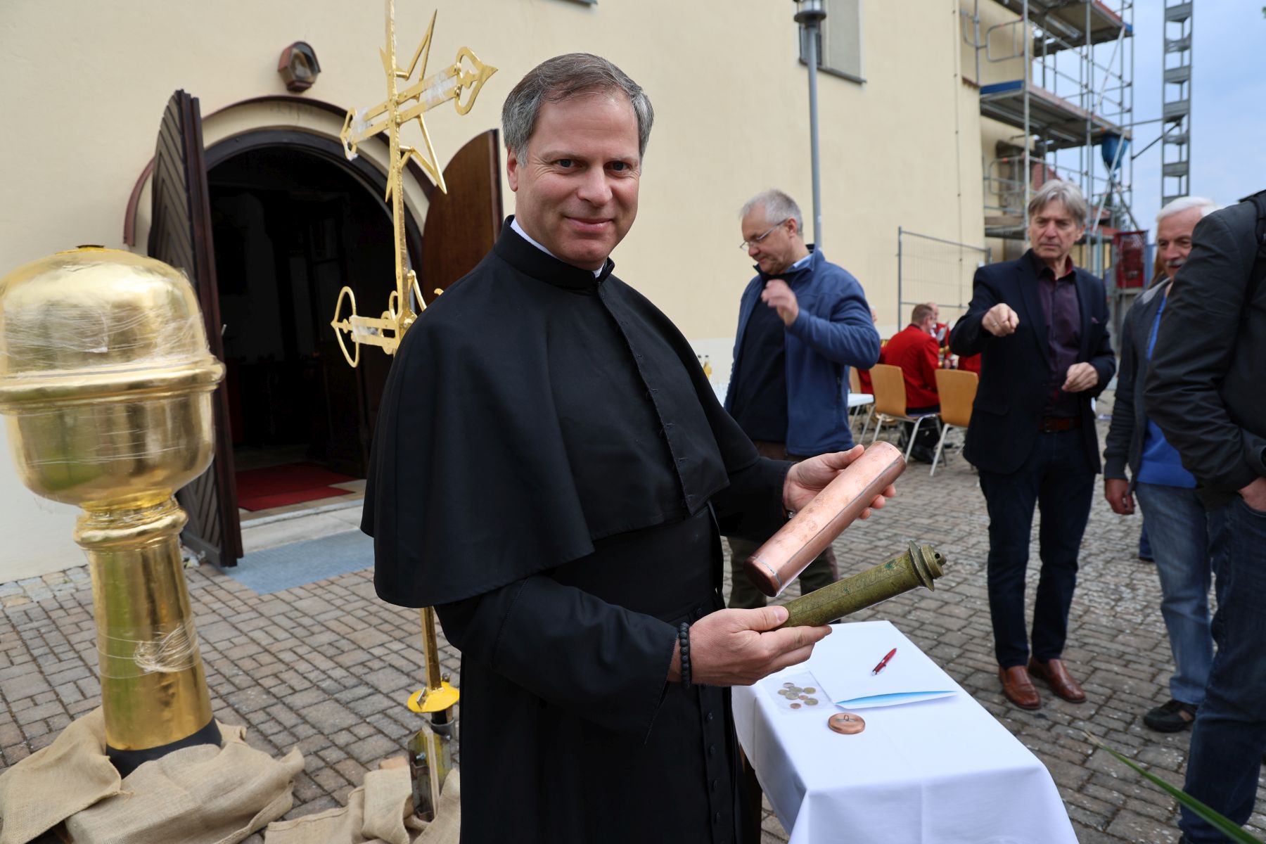 Gruppenbild mit Pfarrer Matthias Steffel, Bürgermeister Gerhard Bauer und Kirchepfleger Marius Birkner vor der Installation des Turmkreuzes