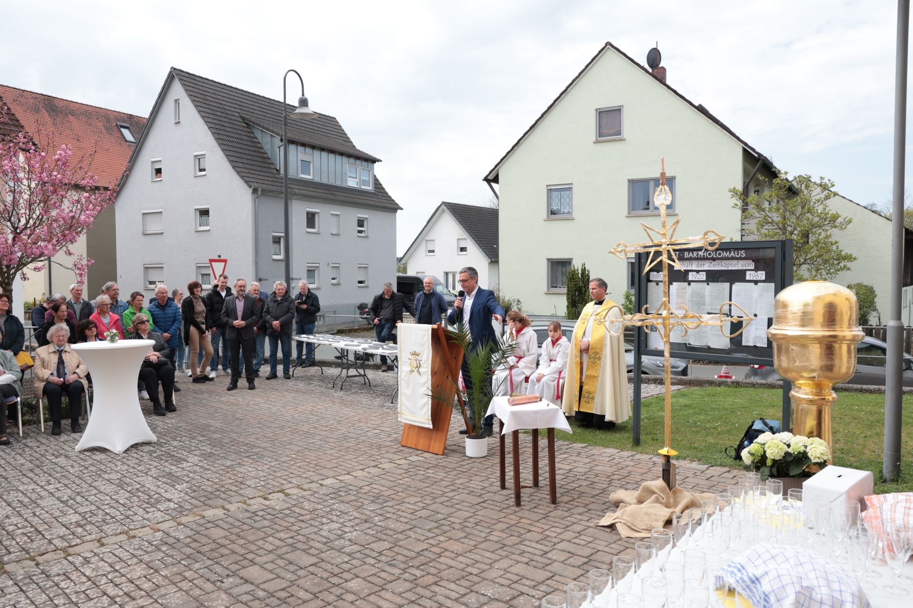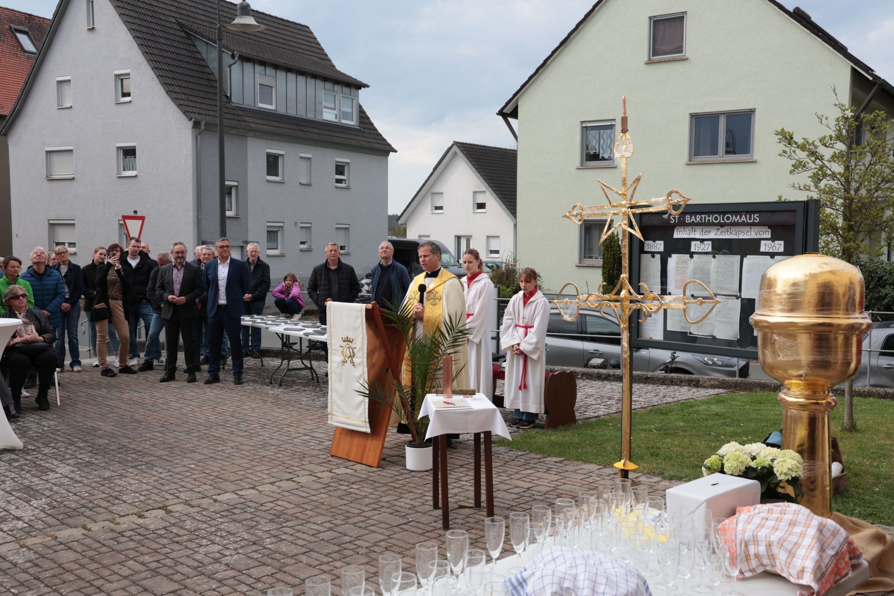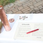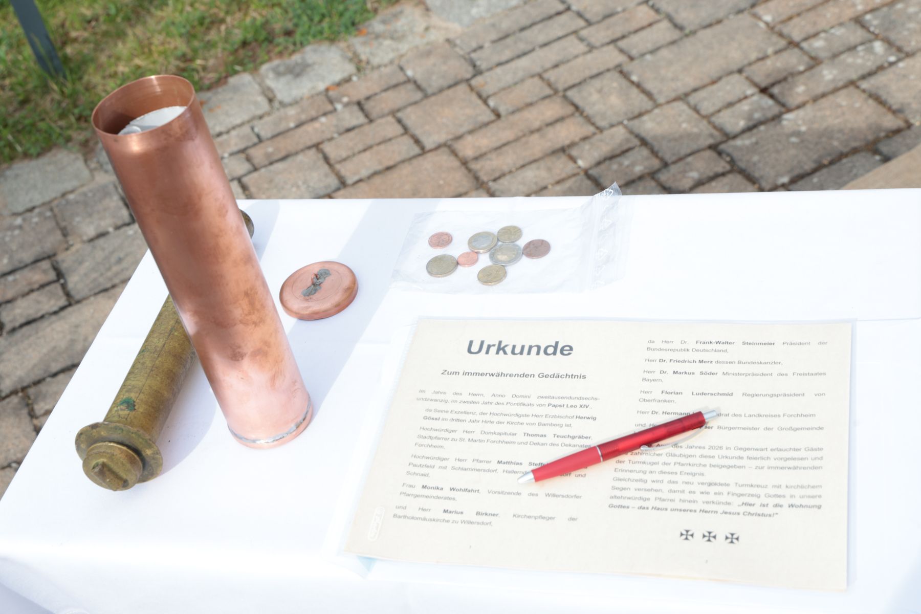 Die Zeitkapsel wurde mit Dokumenten (einer aktuellen Zeitung, einem Gemeindeblatt, den alten und einer neuen Chronik) sowie aktuellen Euro-Münzen bestückt.