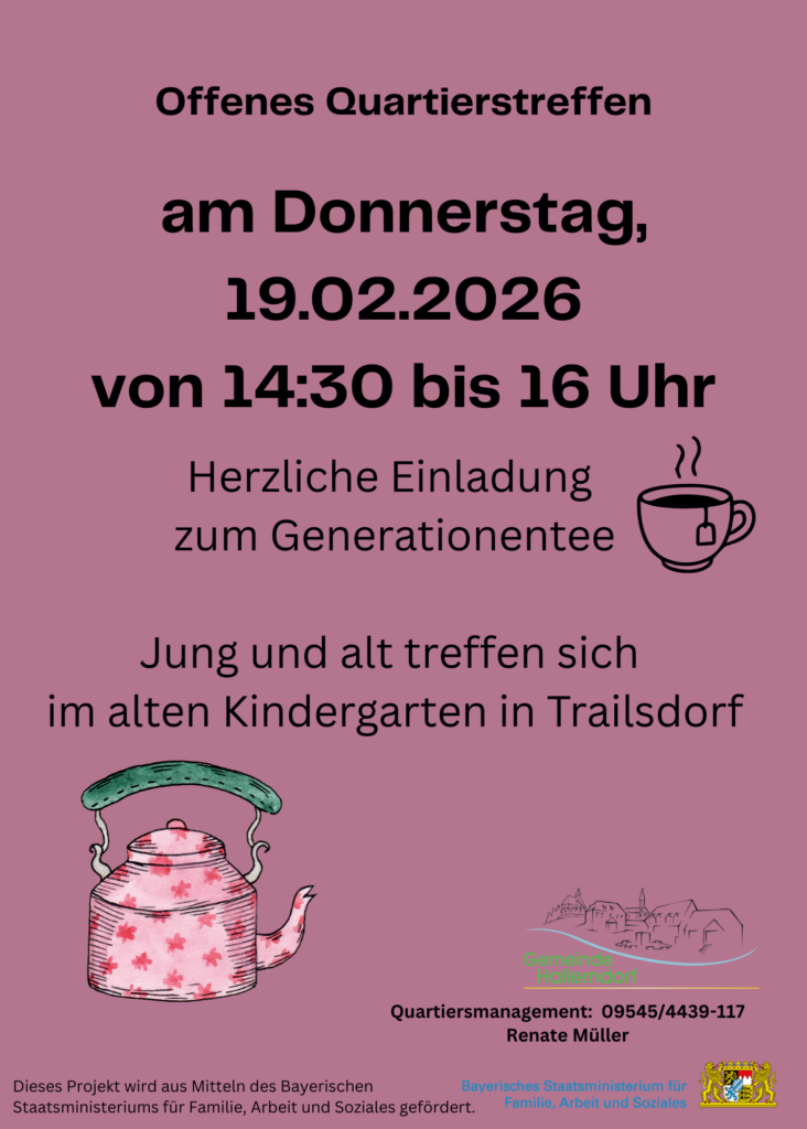 19.02.2026 14:30 bis 16:30 Uhr Generationentee im alten Kindergarten in Trailsdorf